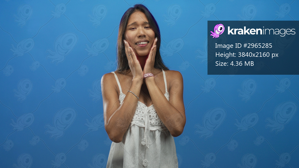 Thai woman touching cheeks with hands in white crochet dress against blue studio backdrop showing yawning, surprise and smiling gestures; surprise playfulness. - Kraken Images