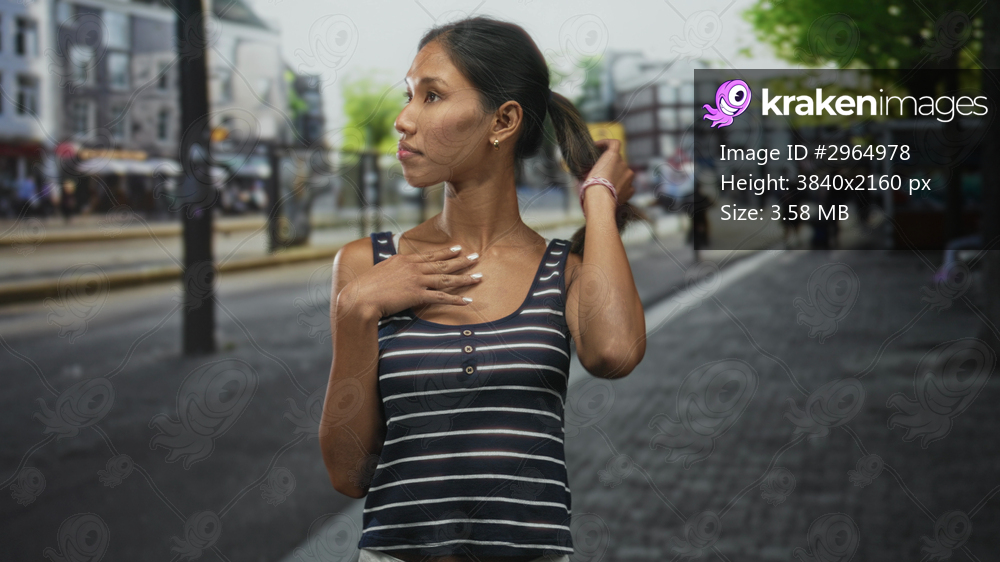 Thai woman touching chest with both hands on street near tram tracks wearing striped tanktop and bracelet; pensive reflection.