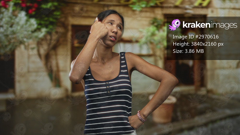 Thai woman touching forehead and coughing, wearing a striped tank top and bracelet, standing before a stone building entrance on a street amid potted plants; fatigue seeking help. - Kraken Images