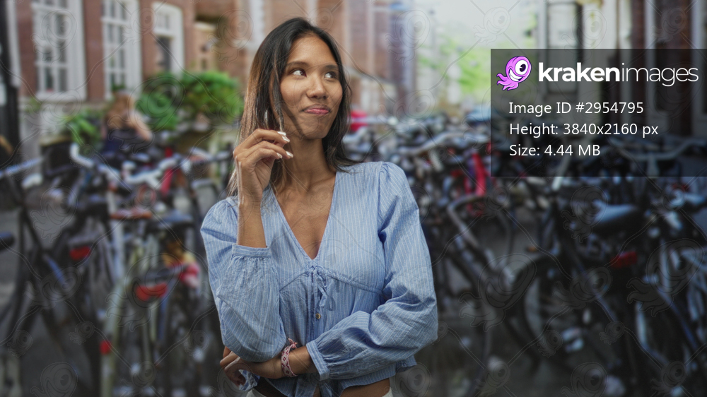 Thai woman touching hair by bicycle rack on street, smiling with hand near face and wearing blue blouse; serene confidence.