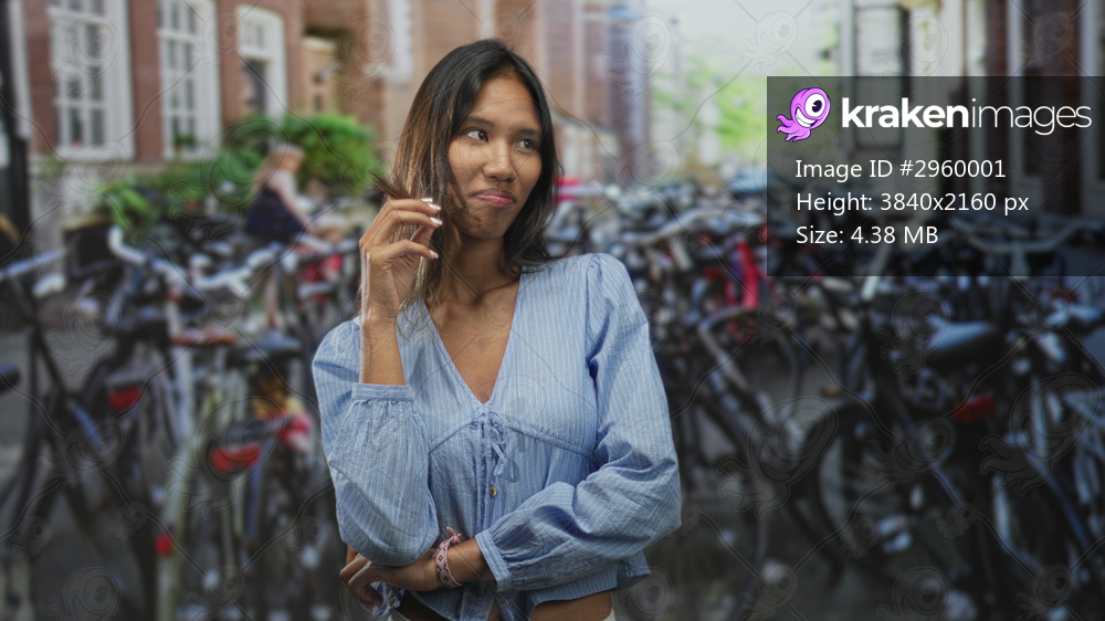 Thai woman touching hair by bicycle rack on street, smiling with hand near face and wearing blue blouse; serene confidence.