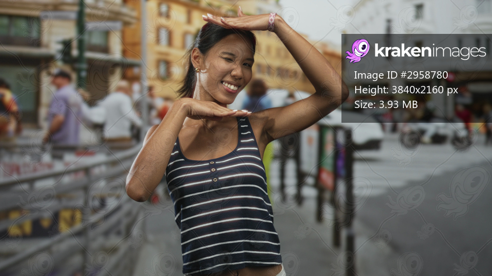Thai woman waving hands and smiling with face visible on a busy city street near buildings and crosswalk, wearing striped tanktop; travel joy.