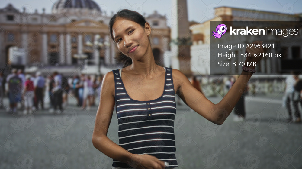 Thai woman wearing a striped tank top points finger with raised right arm and visible hand gesture in front of a historic building and crowded square; vacation travel playful. - Kraken Images