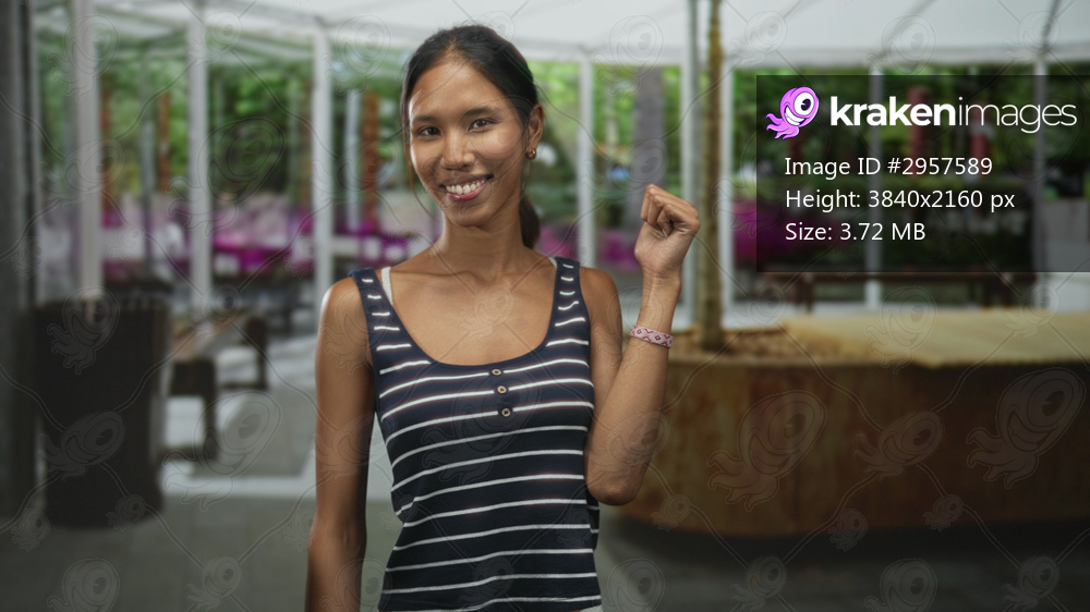 Thai woman wearing a striped tank top and ponytail, hand on hip and pinched fingers raised near face beside a wooden table under a canopy inside a building with plants; playful confidence. - Kraken Images