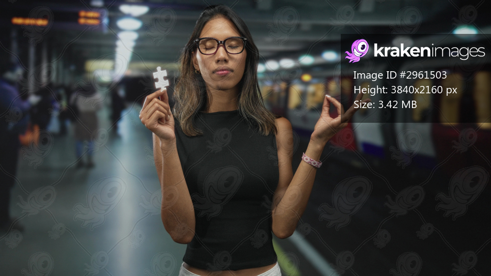 Thai woman wearing glasses and black sleeveless top holds a white puzzle piece between fingers and makes ok hand gesture in a building subway platform; serenity. - Kraken Images