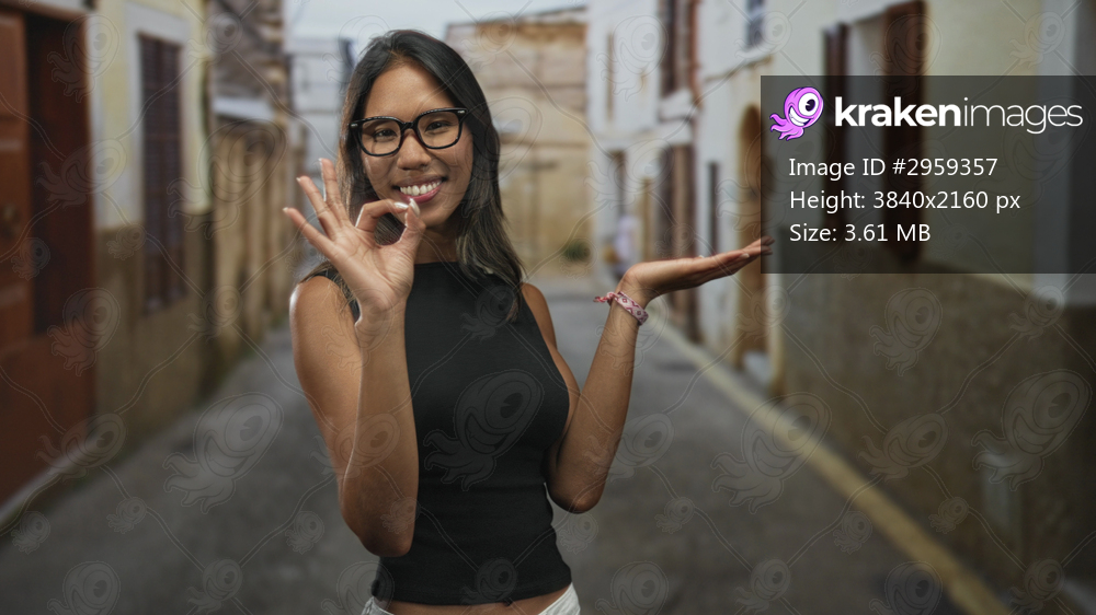 Thai woman wearing glasses makes ok sign with right hand and holds left palm up on a street lined with old buildings; confident approachable travel.