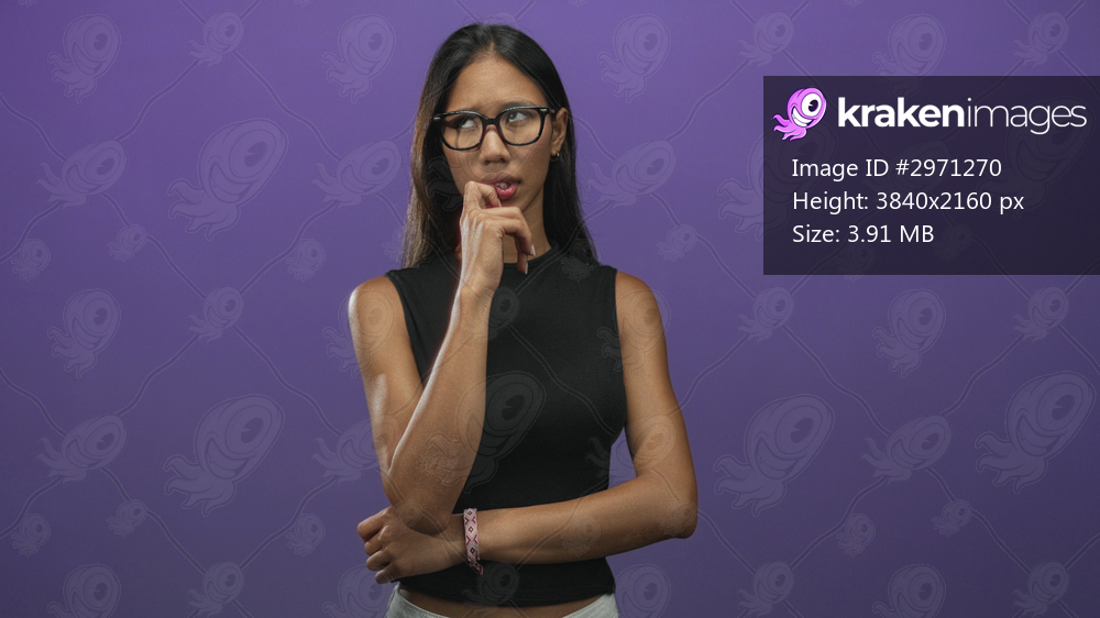 Thai woman wearing glasses touches chin with index finger, arm crossed and wristband visible, standing before purple studio wall; contemplation.