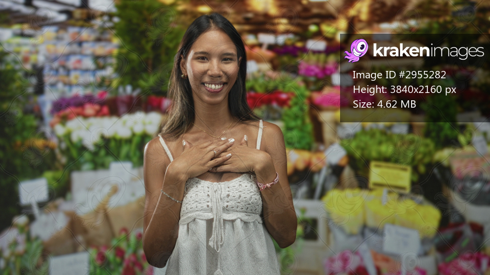Thai woman wearing white crochet dress with hands on chest smiling amid bouquets and price tags at a flower market building; joyful gratitude.