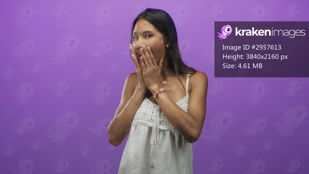 Thai woman wearing white crochet top, covering mouth with hands, mouth open in a yawn against a purple studio backdrop; surprise curiosity.