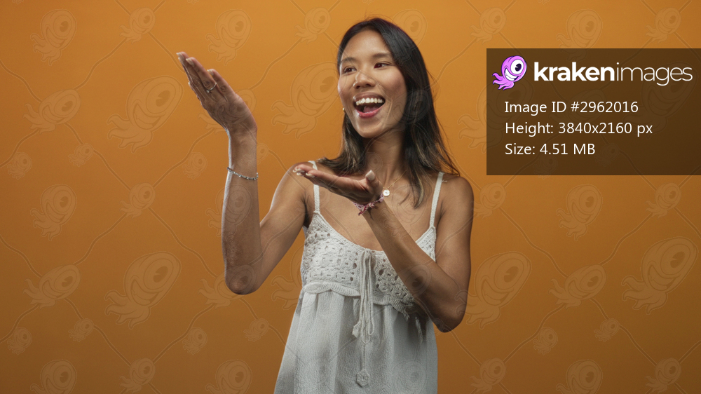 Thai woman wearing white sundress smiles and presents palms up with open hands while tilting head in studio; joyful play.