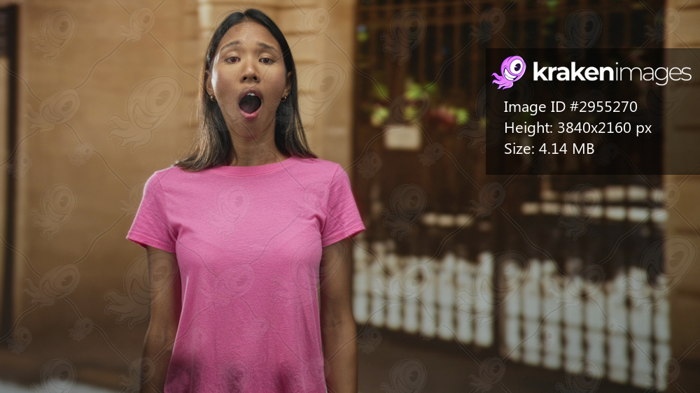 Thai woman yawning with hand covering mouth in a pink t shirt standing by an iron gate at a building entrance; fatigue.