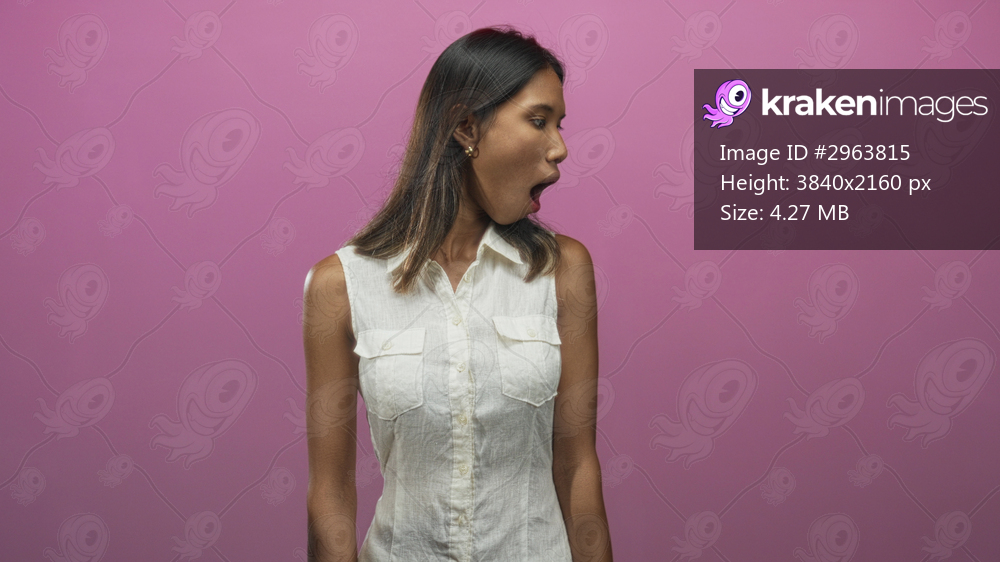 Thai woman yawning with mouth open in studio, wearing sleeveless white blouse and looking sideways; tiredness solitude.