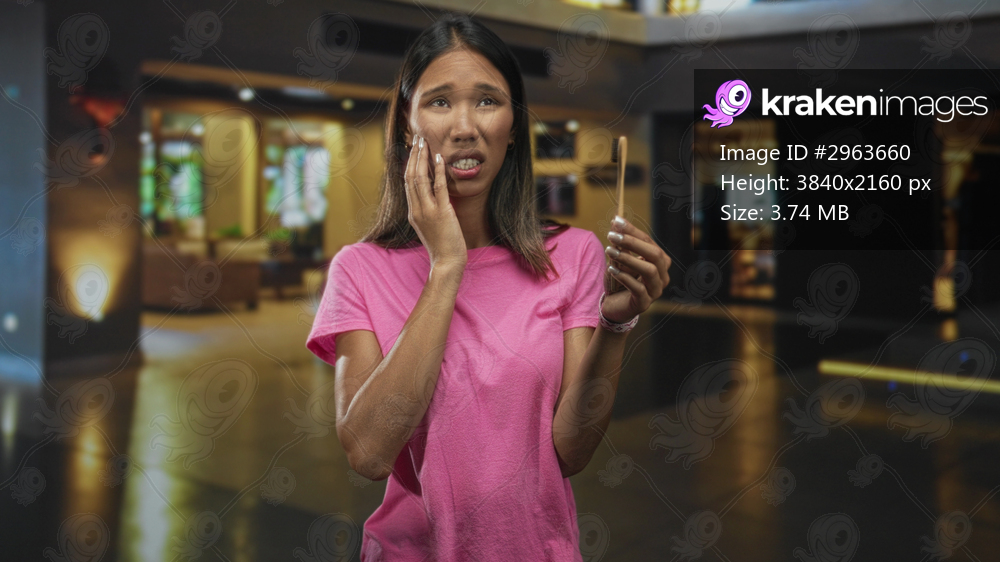 Thai woman, young southeast asian brunette, holding toothbrush, hand on cheek and wincing from toothache in a building lobby; concern dental care.