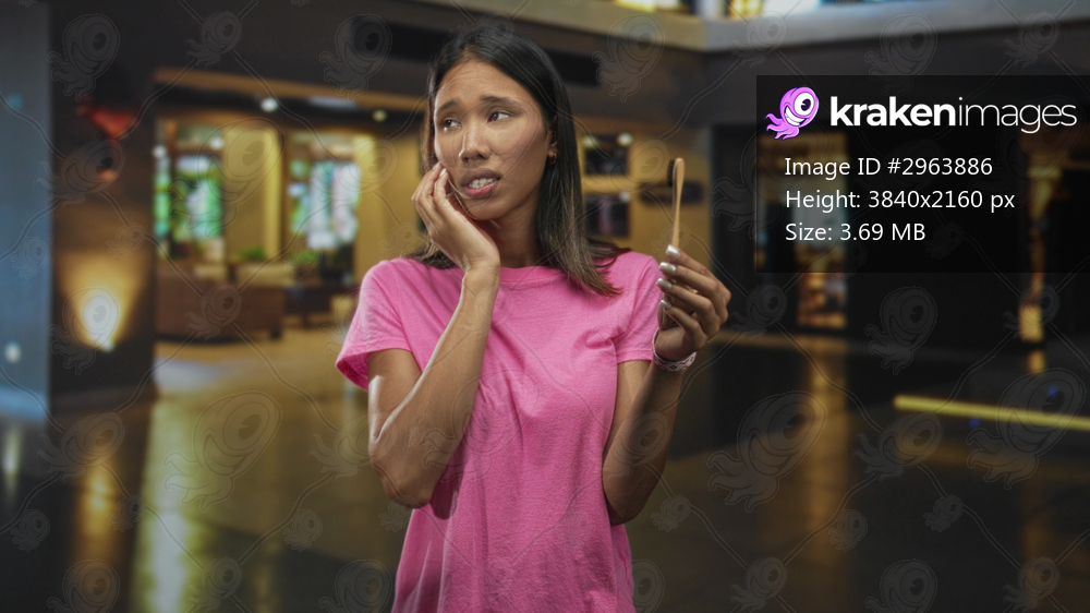 Thai woman, young southeast asian brunette, holding toothbrush, hand on cheek and wincing from toothache in a building lobby; concern dental care.