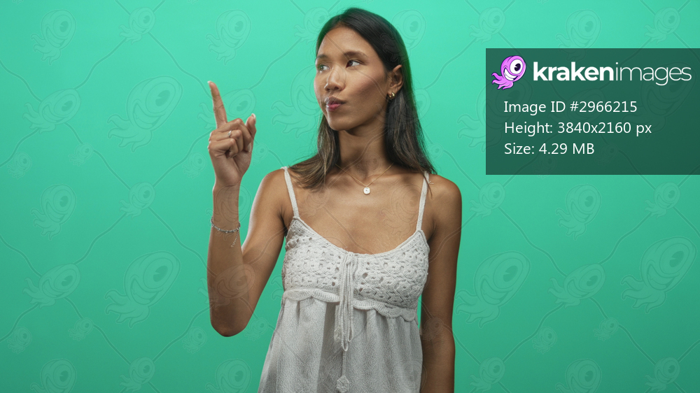 Thai young brunette woman in white crocheted dress points both index fingers upward with a calm smile in a green studio; playful confidence.