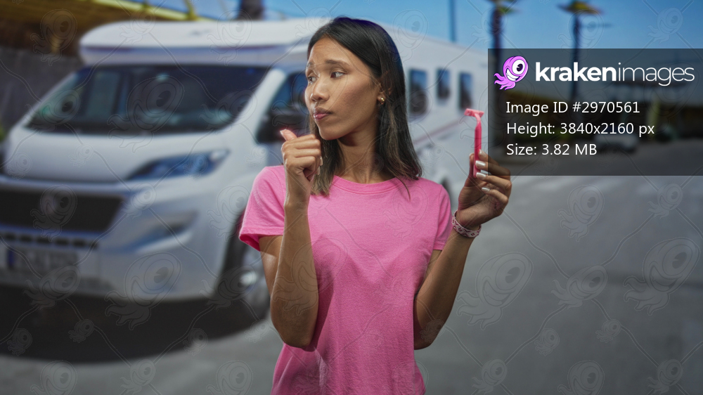 Thai young southeast asian brunette woman holding a pink razor near face and showing a thumb up in front of a parked camper van on a sunny street; grooming doubt. - Kraken Images