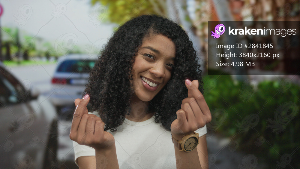 This african american woman wearing a white tee makes a finger heart gesture with both hands toward the camera on a busy city street; affection.