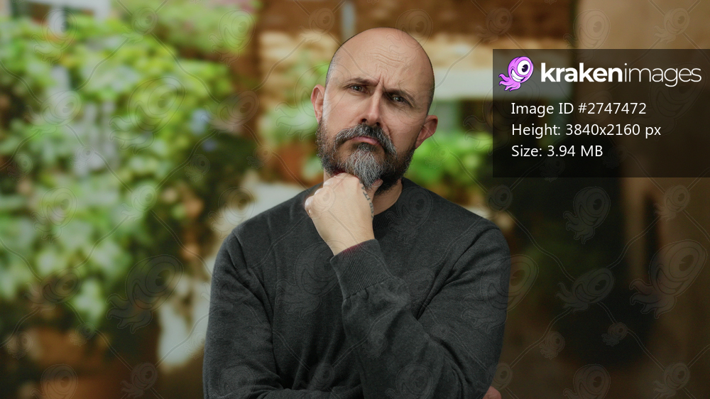 Thoughtful bald man with beard stands outdoors in urban setting with greenery contemplating decision or idea