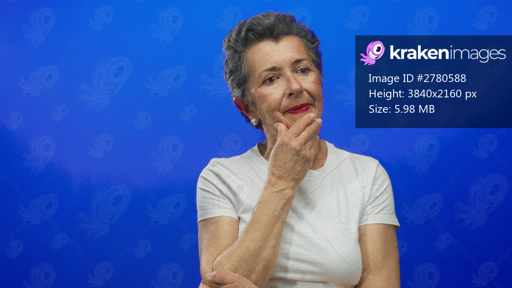 Thoughtful senior woman with grey hair wearing white shirt against blue background appears deep in contemplation.
