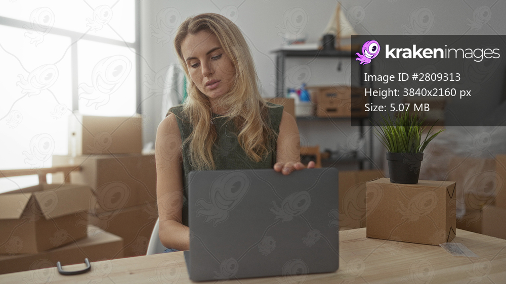 Tired woman closes laptop in a new home surrounded by moving boxes and plants in a bright living room apartment setting indicating moving or transition. - Kraken Images