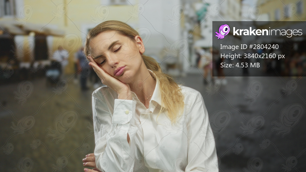 Tired young blonde woman standing on a busy city street with eyes closed, wearing a white blouse, against a blurred urban backdrop, expressing exhaustion outdoors in the daytime. - Kraken Images