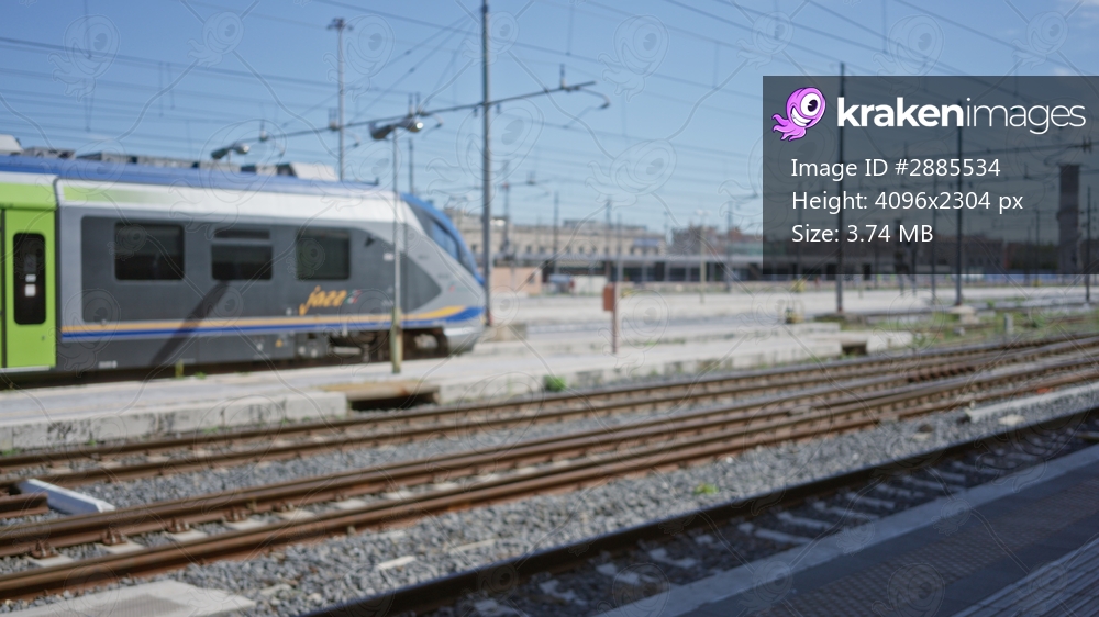 Train station defocused background with blurred tracks and out of focus train cars; background backplate copyspace calm.