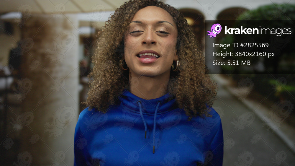 Trans woman with curly hair purses lips in warm sunlit old town street under stone arches; playfulness.