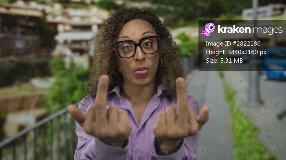 Trans woman raising middle finger at camera on street near sidewalk railing amid blurred city buildings; defiance.