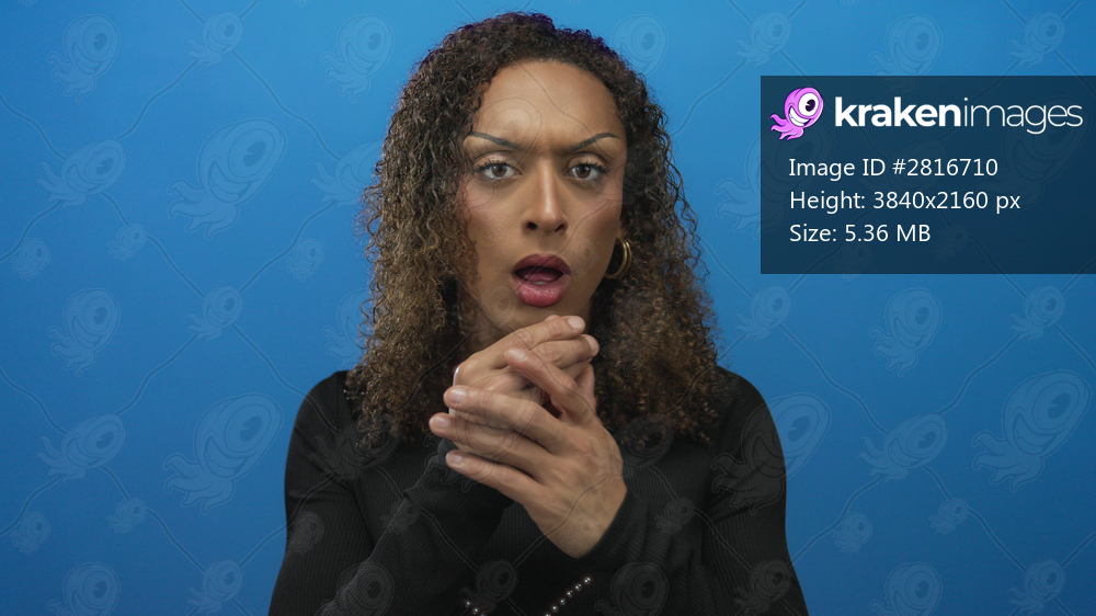 Transgender hispanic woman with curly hair wearing black top hand covering mouth in blue studio; surprise.