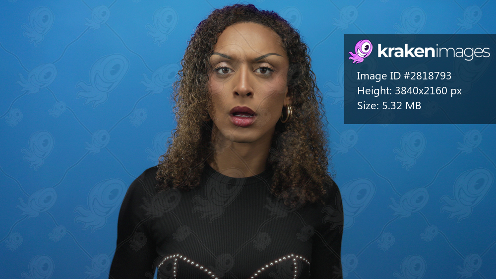 Transgender hispanic woman with curly hair wearing black top hand covering mouth in blue studio; surprise.