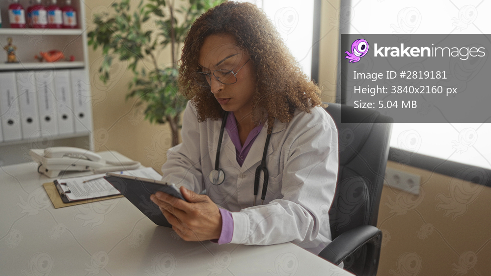 Transgender hispanic woman doctor wearing stethoscope holding tablet with hands reading patient records in clinic; dedication.