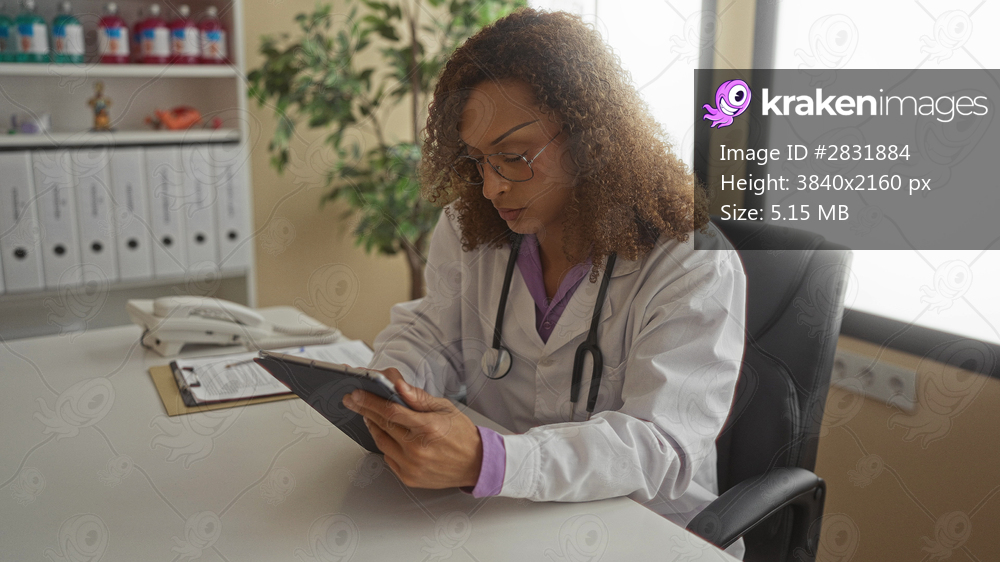 Transgender hispanic woman doctor wearing stethoscope holding tablet with hands reading patient records in clinic; dedication.