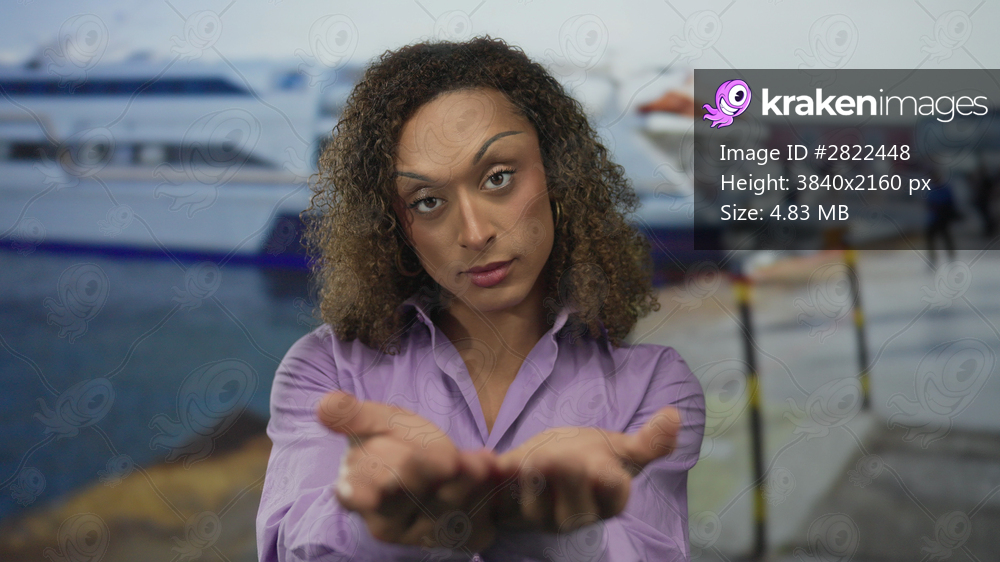 Transgender hispanic woman extends both hands with open palms toward camera on street pier near boat; hope.