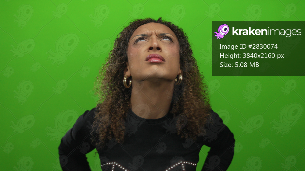 Transgender hispanic woman holds head with both hands in green studio setting while looking upward with a scrunched expression; frustration stress pain. - Kraken Images