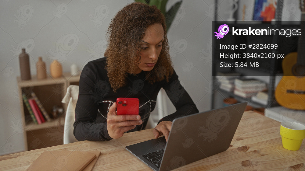 Transgender hispanic woman holds red smartphone and types on laptop in modern office with bookshelves and guitar; concentration.