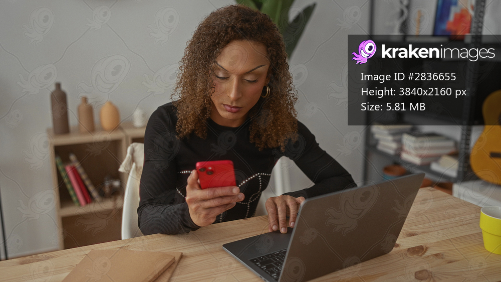 Transgender hispanic woman holds red smartphone and types on laptop in modern office with bookshelves and guitar; concentration.