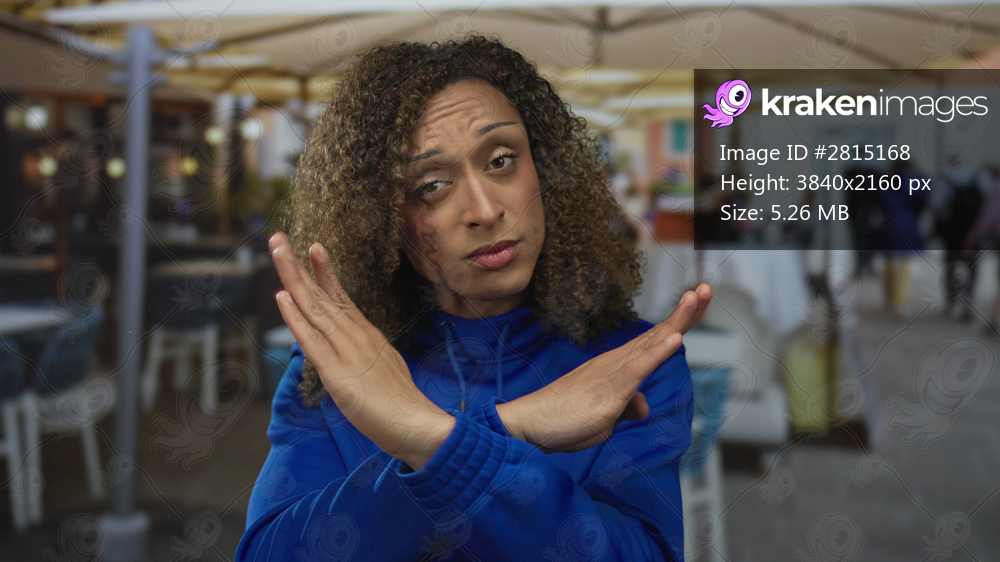 Transgender hispanic woman in blue hoodie crosses arms in denial gesture at outdoor restaurant terrace; defiance.