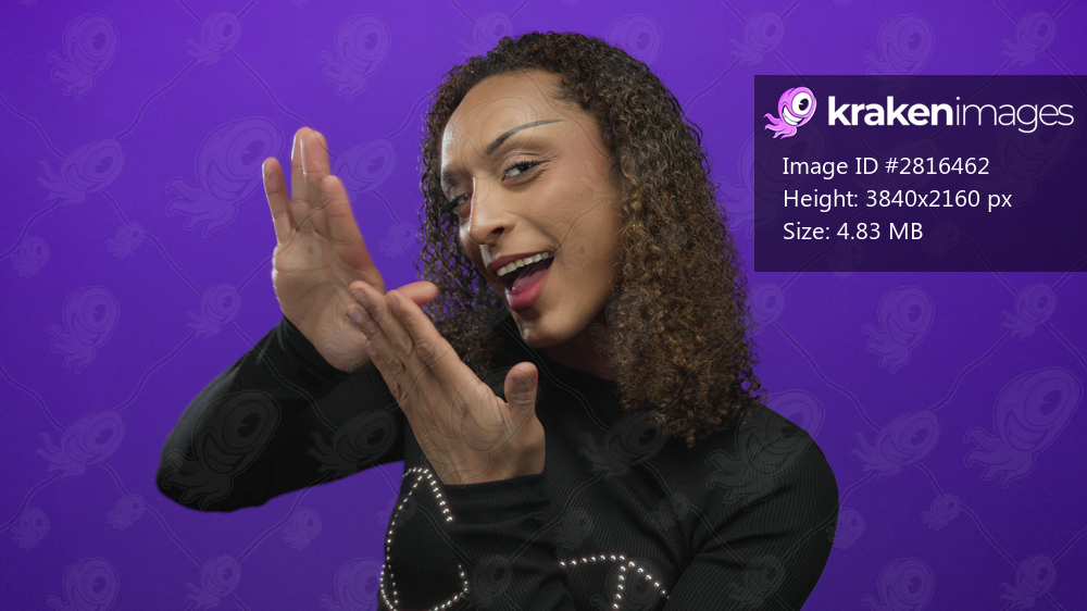 Transgender hispanic woman makes money gesture with fingers in a purple studio set; greed wealth desire.