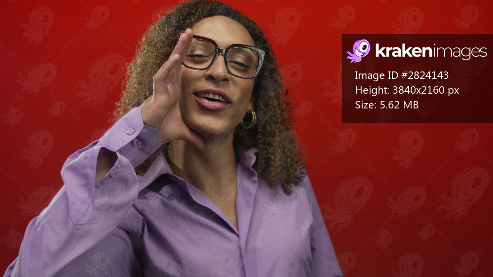Transgender hispanic woman wearing glasses and shouting with mouth and cupped hand in red studio; confidence.
