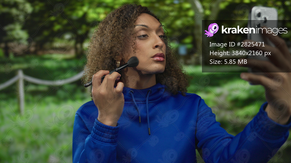 Transgender woman applies makeup brush to cheek while holding smartphone in lush green forest; confidence.