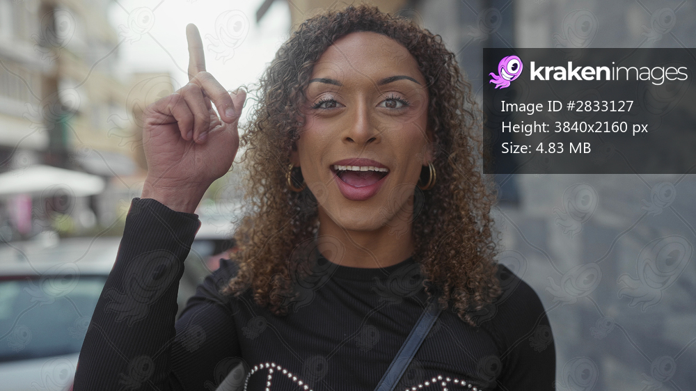 Transgender woman with curly hair points finger upward on city street lined with parked cars and stone facade; inspiration.