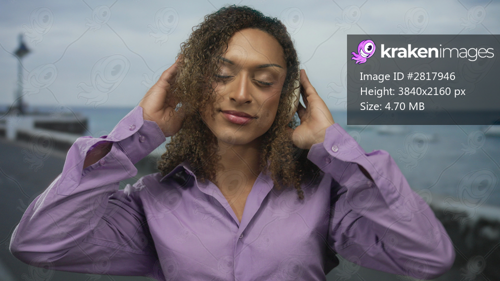 Transgender woman holding headphones with eyes closed listening to music on street; serenity and empowerment.
