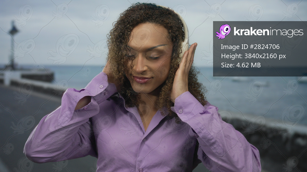 Transgender woman holding headphones with eyes closed listening to music on street; serenity and empowerment.