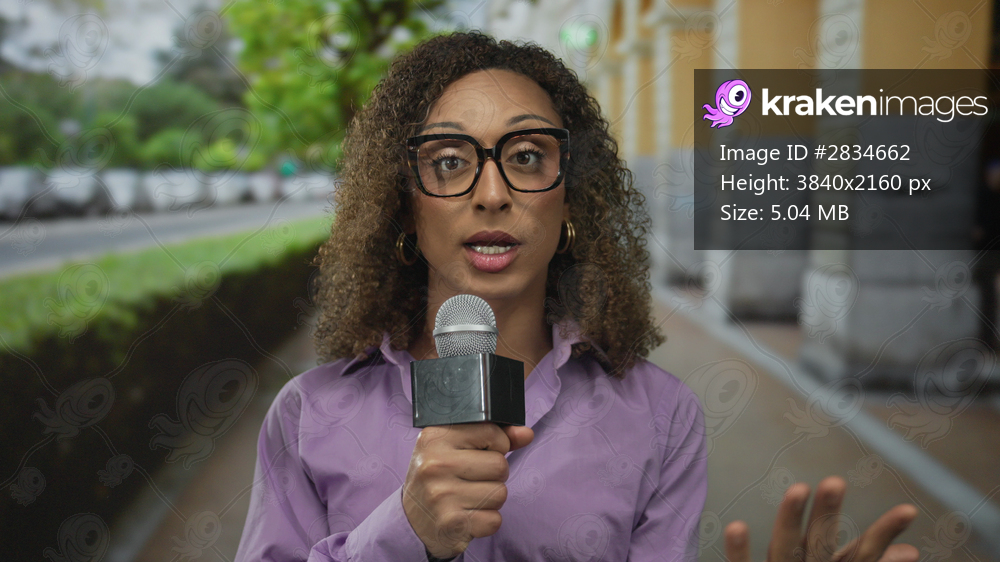 Transgender woman holding microphone in purple shirt on city street next to building wall; news reporting determination.