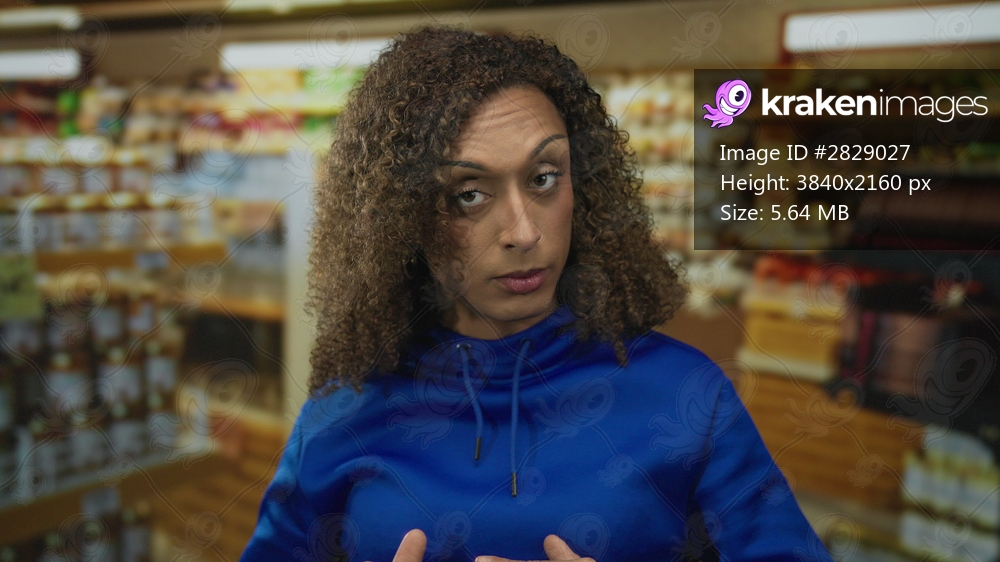 Transgender woman holds hands horizontal at supermarket aisle with grocery shelves and jars in vibrant store interior; caution.