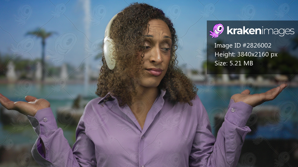 Transgender woman in purple shirt wearing white headphones shrugs with raised hands by fountain in park under blue sky; uncertainty.