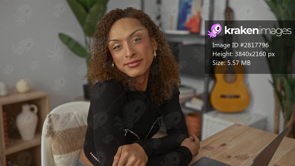 Transgender woman rests chin on hand seated at wooden desk with laptop and guitar in studio; serene reflection.