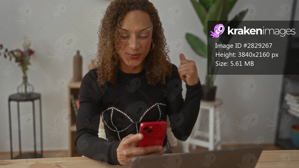 Transgender woman seated at wooden desk holds smartphone and pumps fist over open laptop in office; success celebration excitement triumph.