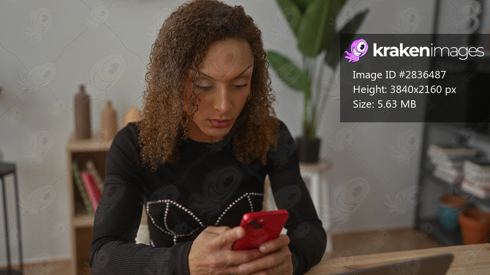 Transgender woman seated at wooden desk holds smartphone and pumps fist over open laptop in office; success celebration excitement triumph.