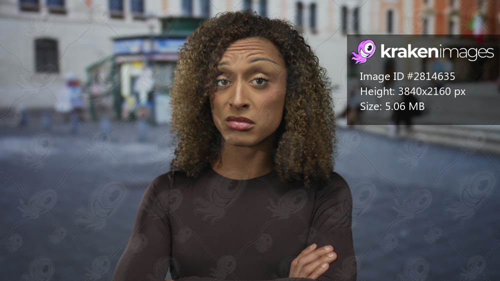 Transgender woman stands with arms crossed on busy urban street in city square under daylight, buildings framing walkway; defiance.